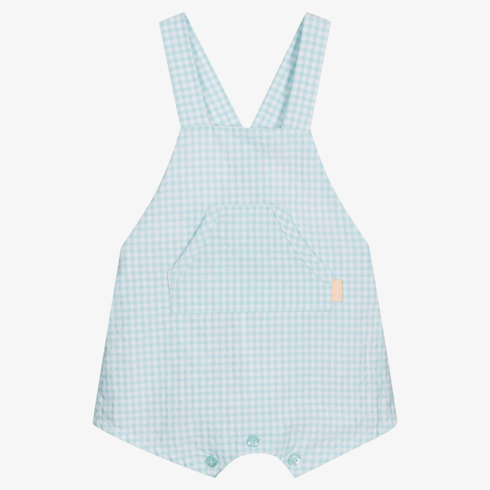 Timeless blue gingham short dungarees for baby boys and girls by Spanish brand Tutto Piccolo. Made in soft and breathable cotton seersucker, they have a pouch pocket on the front with a tag logo. There are button fastenings on the cross-over shoulder straps and between the legs for simple dressing.