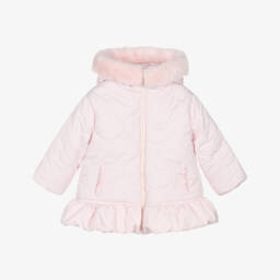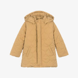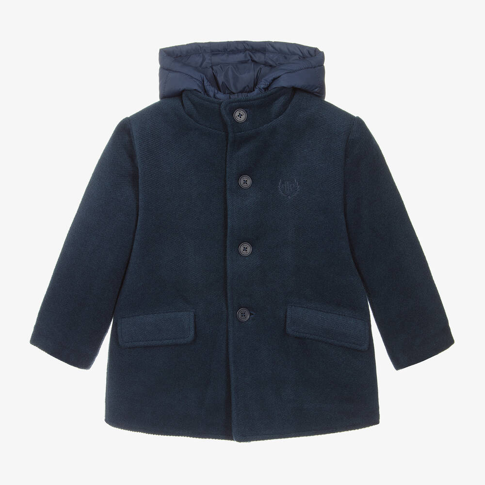 Stylish navy blue coat for boys by Spanish brand, Tutto Piccolo, made soft felted fabric with a textured diagonal rib. For a cool, layered look, it has an attached, puffer-style hood and chest insert that fastens wtih a zip. The outer coat has a standup collar, branded button fastenings and flap pockets. A tonal embroidered logo on the chest adds a discreet branded touch.
