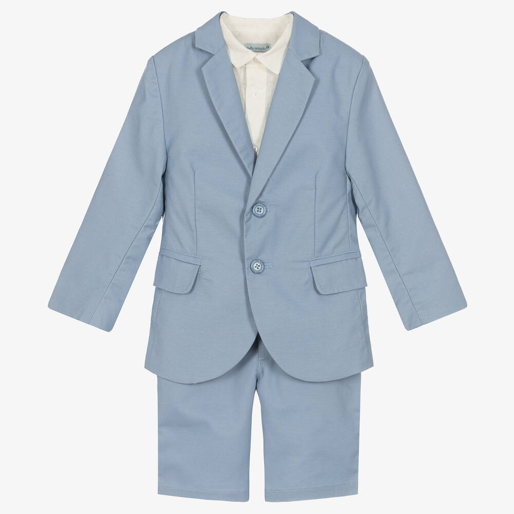 A blue and ivory cotton shorts suit for boys by Tutto Piccolo, made from a soft cotton-blend with a fine needlecord look. In a smart-casual style, the fully lined blazer has a classic notched lapel, branded button fastenings, and flap pockets. The coordinating shorts fasten with a zip and button, have useful pockets, and an adjustable waist for a comfortable fit. Made from lightweight linen, the button-up shirt has a pointed collar and a tonal embroidered logo on the chest. The long sleeves can be rolled up and secured in place using the internal tabs and buttons on the arm.