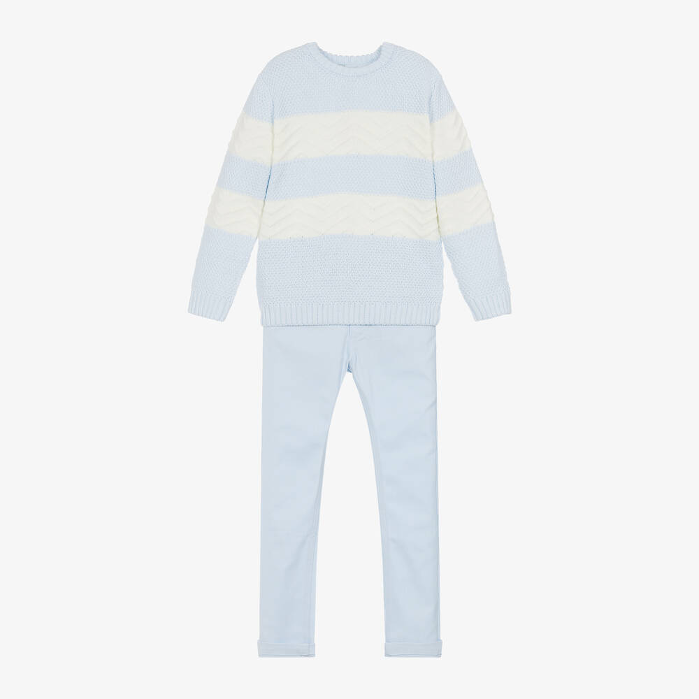 Pale blue jumper and trouser set for boys by Tutto Piccolo. Knitted in a soft cotton blend with a textured pattern, the crew neck jumper has contrasting white stripes and ribbed trims. The casual, cotton twill trousers are designed with a slight stretch and have an adjustable waist for comfort. A classic five-pocket style, they fasten with a zip and branded popper.