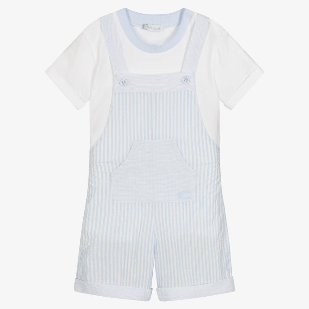 A blue and white dungaree set for little boys by Tutto Piccolo, made from soft and lightweight cotton. In a heritage stripe design, the dungarees have a contrast pouch pocket, with a patch logo attached. The shoulder straps cross-over onto the elasticated back, usefully fastening with logo-printed buttons. Classically paired, the jersey T-shirt has roll-up sleeves, neatly decorated with a logo patch. There are popper fastenings on the shoulder to complete this easy dressing style.