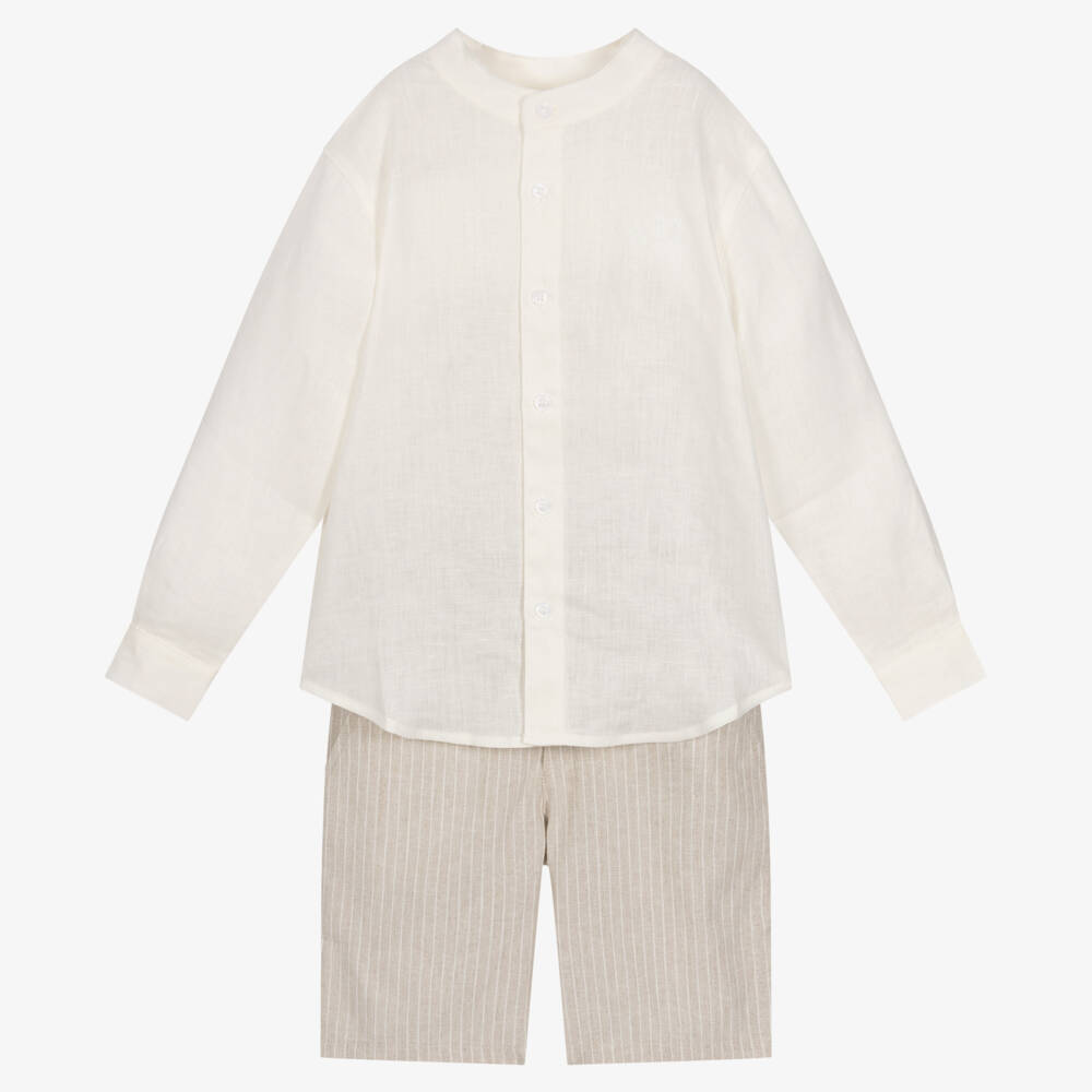 A ivory and beige linen shorts set for little boys, by Spanish Brand Tutto Piccolo. Lightweight for warm weather wear, the shirt comes in a traditional collarless style, with pearlescent button fastenings beneath. The brand's signature tonal logo is embroidered for minimalistic distinction. Finishing off the outfit are a pair of striped shorts, which have four pockets, with a zip and button fastening. They have an adjustable waistband for the best fit.