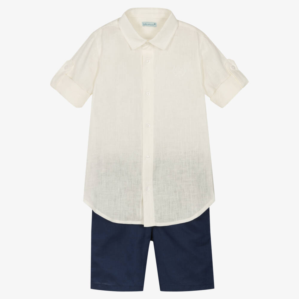 Easy-to-wear and style, this ivory and navy blue shorts set for boys is from Tutto Piccolo. Made from lightweight linen, the shirt has button fastenings, with roll-up sleeves that secure with buttons. A tonal crest logo is embroidered on the chest. Adding a relaxed feel to the outfit, the matching shorts have four-pocket styling, with a zip and button closure. They are comfortably finished with an adjustable waist.