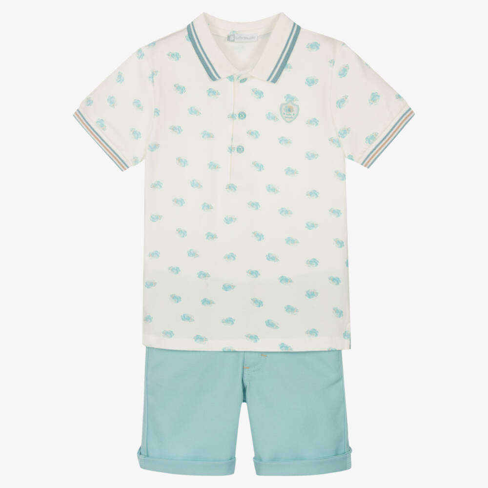 An ivory and turquoise green shorts set for boys by Tutto Piccolo, made from the softest cotton. In a fun tropical fish pattern, the jersey polo shirt has ribbed trims, with button fastenings on the front. A patch logo badge is featured on the chest. The matching twill shorts have classic five-pocket styling, with a useful zip and popper fastening. There is an adjustable waistband for a comfortable fit.