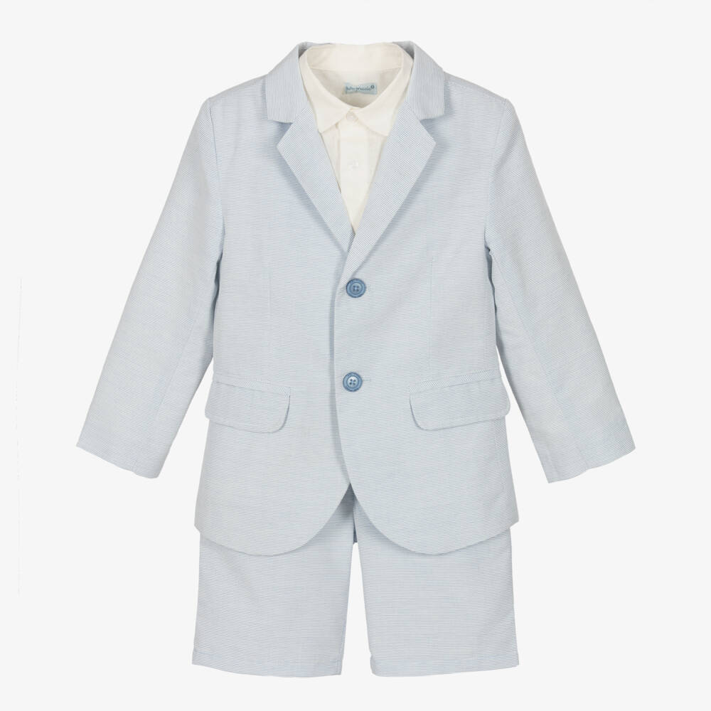 Lovely light blue suit for boys by Tutto Piccolo, with a lightweight linen shirt. The ivory shirt has a front button placket, barrelled cuffs and a tonal logo embroidered on the chest for a subtle branded touch. Fully lined, the soft striped blazer jacket has a classic lapel collar with buttons and flap pockets on the front. Completing the set, the matching shorts fasten with a single button and zip and are fitted with an adjustable waist for growing little ones.
