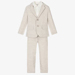 A smart mint green shorts suit for boys by Tutto Piccolo, made in a comfortable cotton and linen blend for warmer days. The single-breasted blazer is styled with a notched lapel, two pockets and a single back vent. Fastening with a button and zip, the shorts have an adjustable waist and four pockets. An ivory linen shirt with a tonal logo embroidery and traditional buttons completes the look.