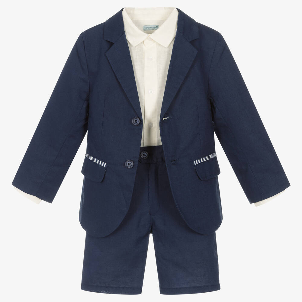 Ideal for warm weather styling, a smart navy blue suit for boys from Tutto Piccolo. Made from lightweight linen, the single-breasted blazer has stripe-trimmed pockets and a silky smooth lining, fastening neatly with buttons. The matching shorts have a zip and button closure, pockets, and an adjustable waist for an ideal, tailored fit. To complete the look, pair with the ivory shirt, which features an embroidered crest logo and relaxed roll-up button sleeves.