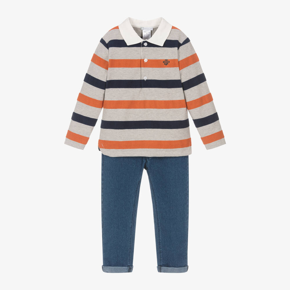 A casual outfit set for boys from Tutto Piccolo, comprising a grey striped rugby shirt and blue jeans. The long-sleeved top is made in soft cotton-blend jersey with woven, textured stripes in navy blue and orange. For a classic casual look, it has an ivory twill collar with button fastenings and an embroidered logo on the chest. It pairs with stretchy, lightweight jeans in a dark blue wash. Fastening with a zip and branded popper, they are styled with five pockets and fixed turn-ups. For comfort, the waistband is adjustable.
