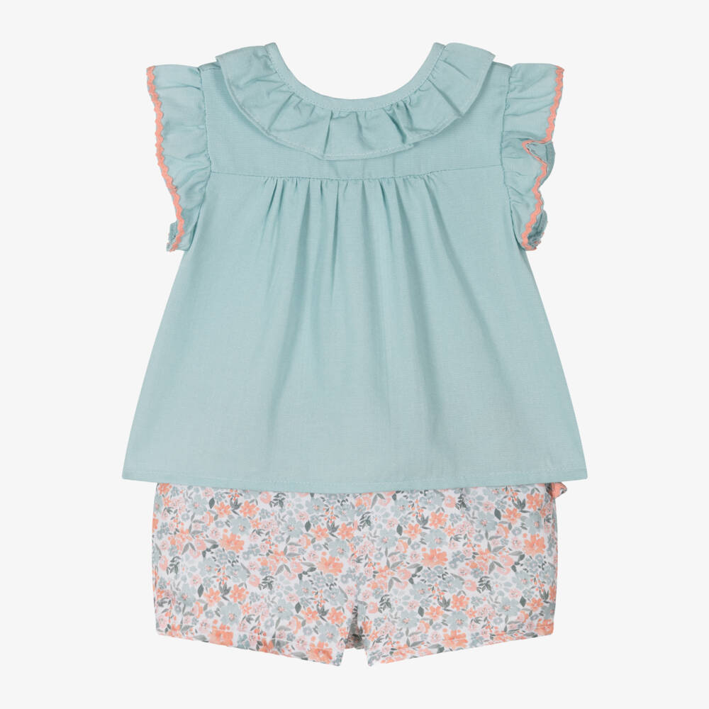 A pretty pink and turquoise blue shorts set for little girls by Tutto Piccolo. Woven in a soft viscose and cotton blend, the blouse has ruffle trims and ric rac detailing, with wooden buttons to fasten. The floral shorts have matching ruffle trims, with an elasticated waistband for comfort. They fasten with a side zip.