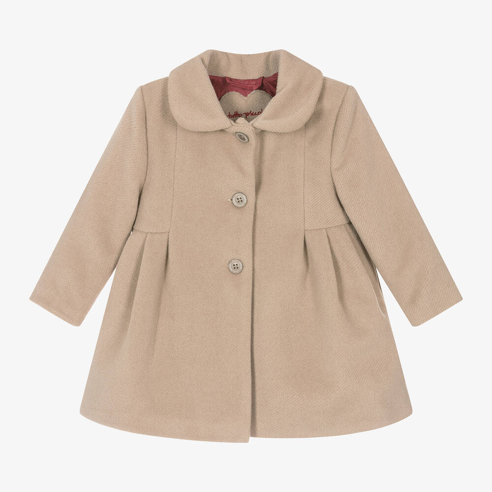 A traditionally styled beige coat for girls from Spanish heritage brand, Tutto Piccolo. Made in beautifully soft felted fabric with a subtle stripe weave, it has a dark red satin lining with a logo jacquard pattern. Pleats on the front and back create a flared silhouette and the collar is rounded for a classic look. Branded button fastenings and concealed side seam pockets complete this charming style.
