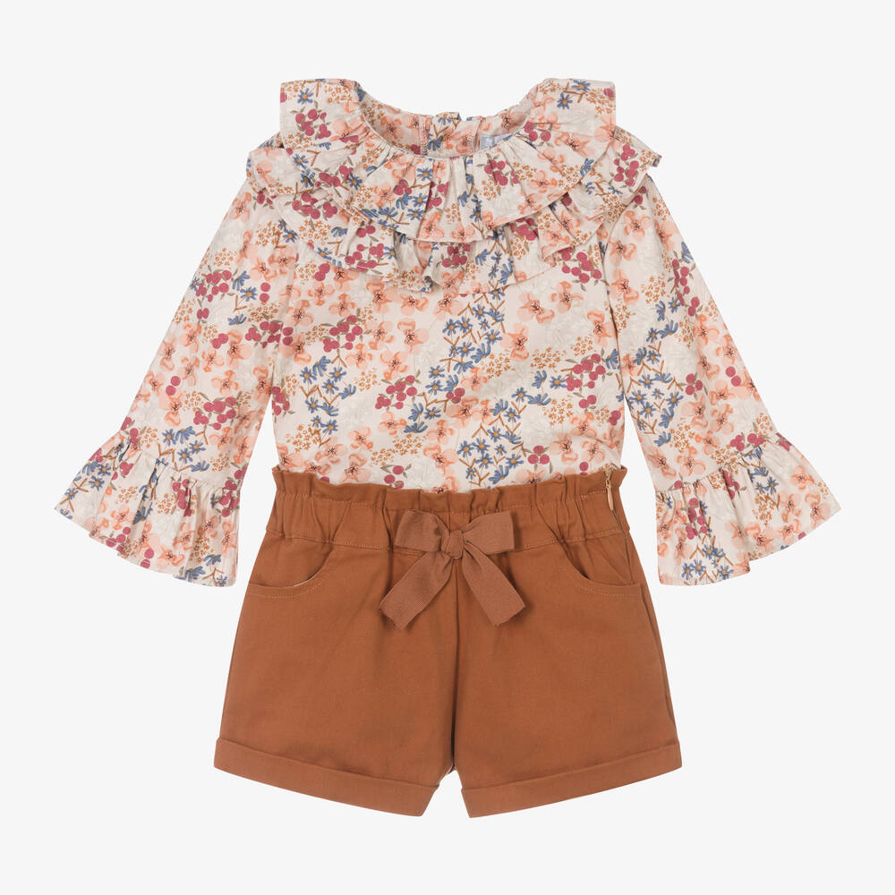 A lovely shorts set for girls by Tutto Piccolo. Made from lightweight cotton and viscose blended twill, the long-sleeved blouse is patterned with a delightful floral print in muted shades of red, blue, and coral orange. Fastening neatly with buttons on the back, it has a pretty frilled collar and cuffs. Smooth and stretchy, the brown shorts have fixed turned up cuffs and useful pockets on both sides. Decorated with a grosgrain ribbon bow on the comfortable elasticated waist, they fasten with a concealed side zip. A pair of burgundy red knitted tights complete the outfit.