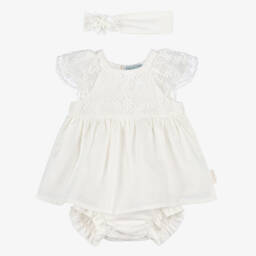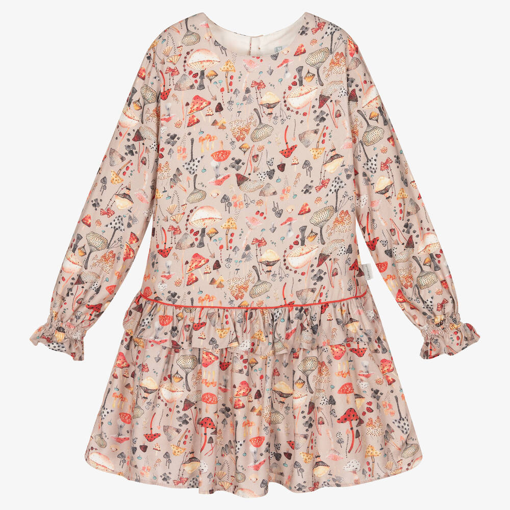 Lovely beige dress set for girls by Spanish brand Tutto Piccolo, with a colourful mushroom print. Made in beautifully soft viscose, the dress has gently elasticated, frilled cuffs, with red piping and a frill around the dropped waist and up the back. It is fully lined in cotton voile for comfort and fastens with pretty mother-of-pearl logo buttons. It comes with red cotton-blend tights with a logo on the sole of the foot.