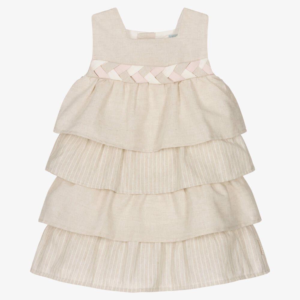 Pretty beige dress for girls by Spanish brand Tutto Piccolo, made in a cool, lightweight linen and cotton blend. It has fixed plait detailing around the bodice in ivory, beige and pink. The skirt has tiers in shades of beige, some with stripes. Fully lined in cotton voile for comfort, it fastens with buttons around the back.