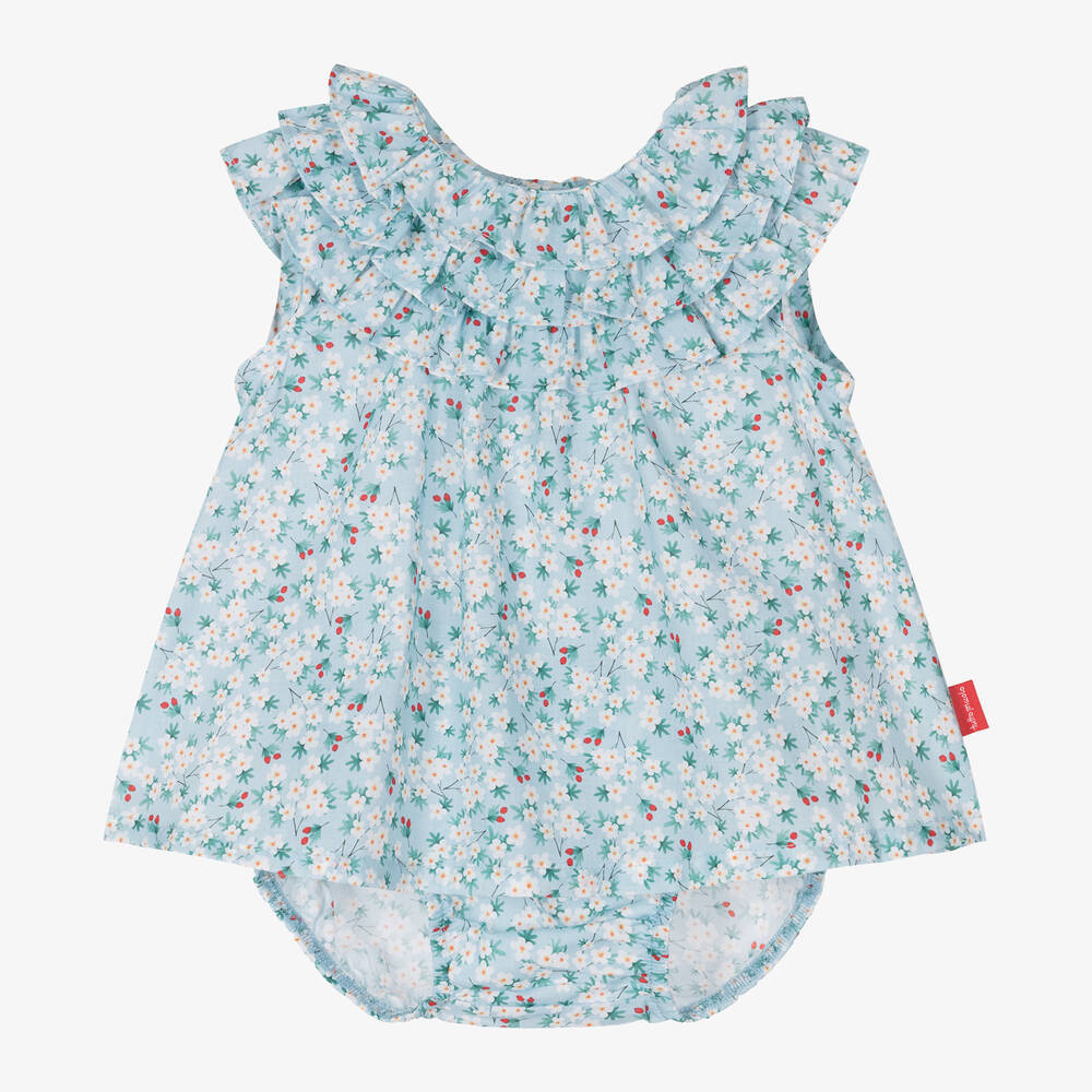 Sweet, light blue dress and knickers for little girls from Tutto Piccolo, with a white and red floral pattern. Ideal for warmer days, the matching pieces are made in soft and lightweight cotton. The sleeveless dress has pretty tiered ruffles around the neckline and button fastenings on the back.