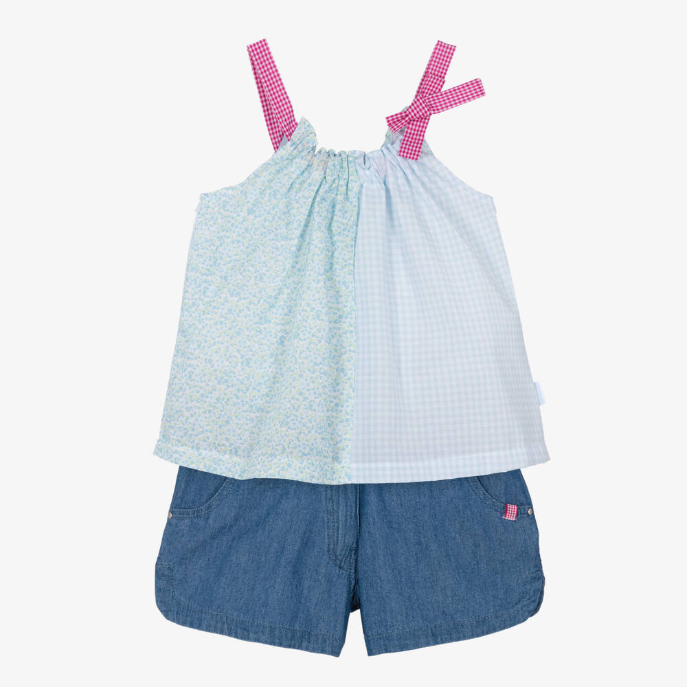 Cute and comfortable, this cotton shorts set for girls is by Spanish brand Tutto Piccolo. The pretty top is made from lightweight poplin, in patchwork style with blue gingham and blue and green floral prints. It has a gathered neckline and red gingham shoulder straps fasten with logo buttons around the back. The chambray shorts have a frilled waistband and fasten with a button and zip. There is a red gingham tab on one front pocket and embroidered logo on one back pocket.
