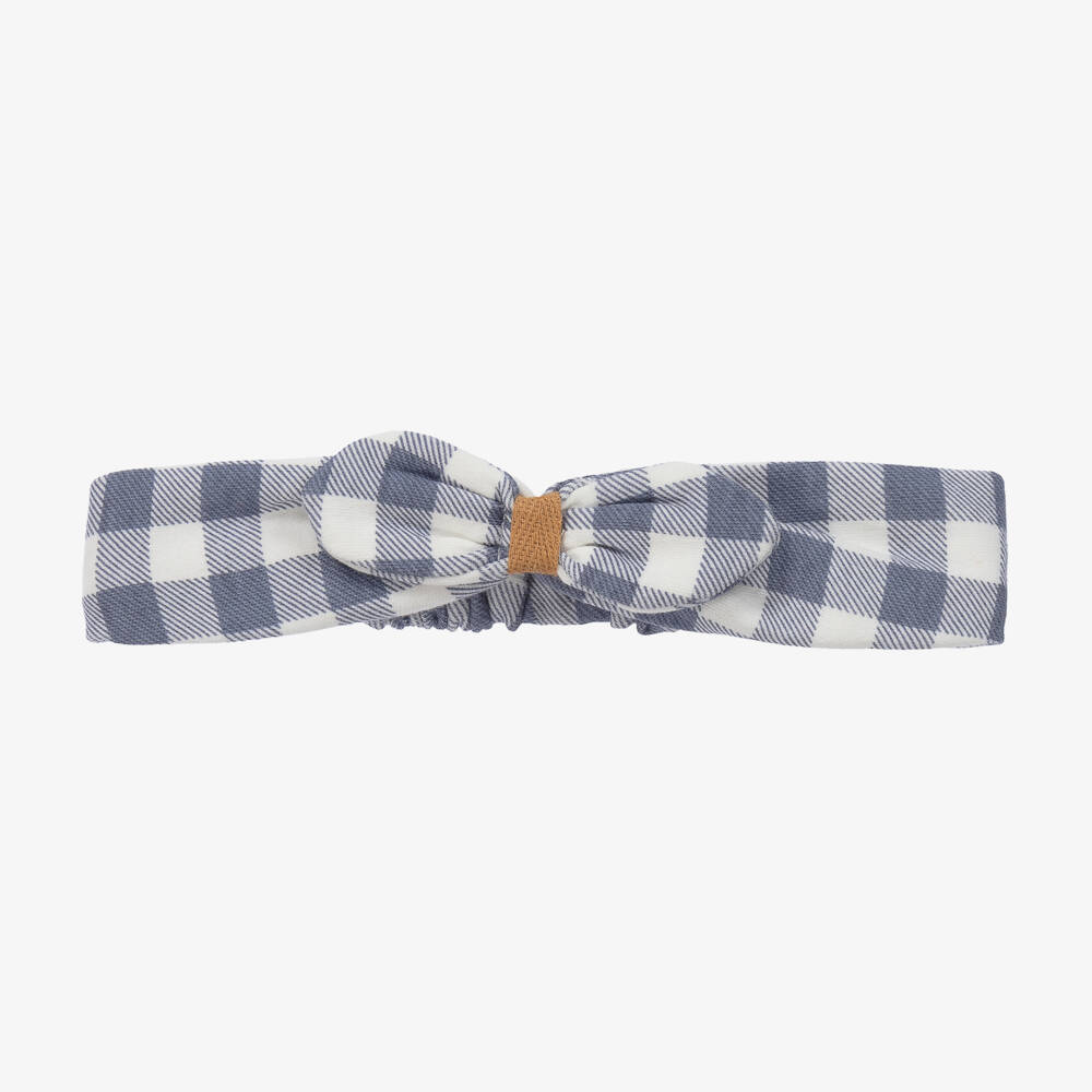 Blue and ivory checked headband for girls by Spanish brand Tutto Piccolo. Made in soft, brushed cotton, it has a fixed bow on the front and an elasticated back for a comfortable fit.