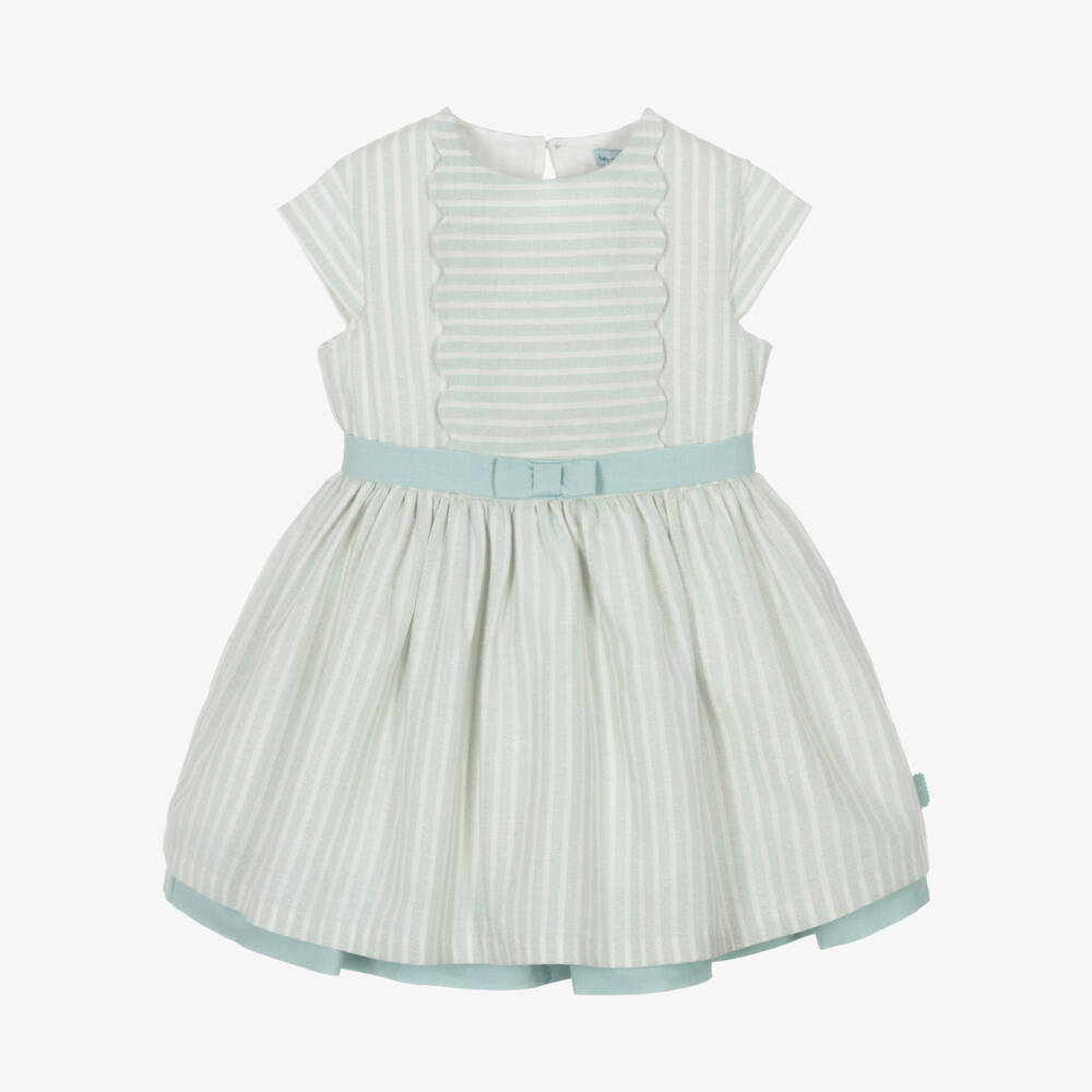A beautiful green and ivory dress for girls by Tutto Piccolo, with shimmery gold thread in the stripes. Made in a cotton and viscose blend with a soft lining, it has scalloped detailing and a fixed sash with a bow. It has a stylish cut-out back fastening with a button on the top and a concealed zip underneath.