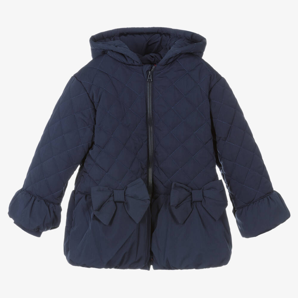 Navy blue padded coat for girls by Tutto Piccolo, made in smooth quilted polyester and lightly padded for added warmth. This beautiful coat is hooded and has two side pockets ideal for warming hands in for colder climates. It fastens with a tonal zip on the front and the lining is printed with the brand's logo in red. To create a feminine silhouette the hem and cuffs are puffed and there are two bow details on the front.