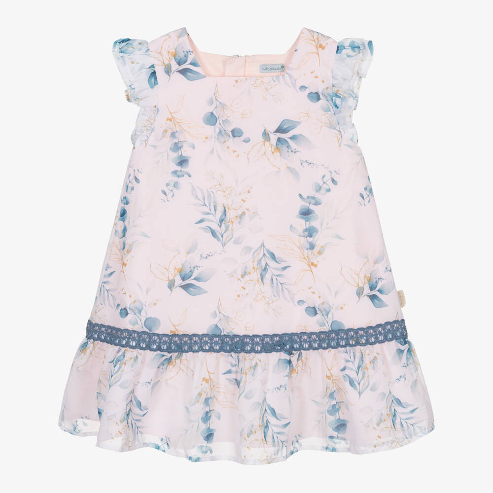 Pretty pink dress for girls by Spanish brand Tutto Piccolo, with an ivory chiffon overlay patterned in blue flowers. There are sweet chiffon ruffles over the shoulders and a blue lace trim on the gathered, drop-waisted skirt. The bodice is lined in pink and there is a neat, concealed zip fastening around the back.