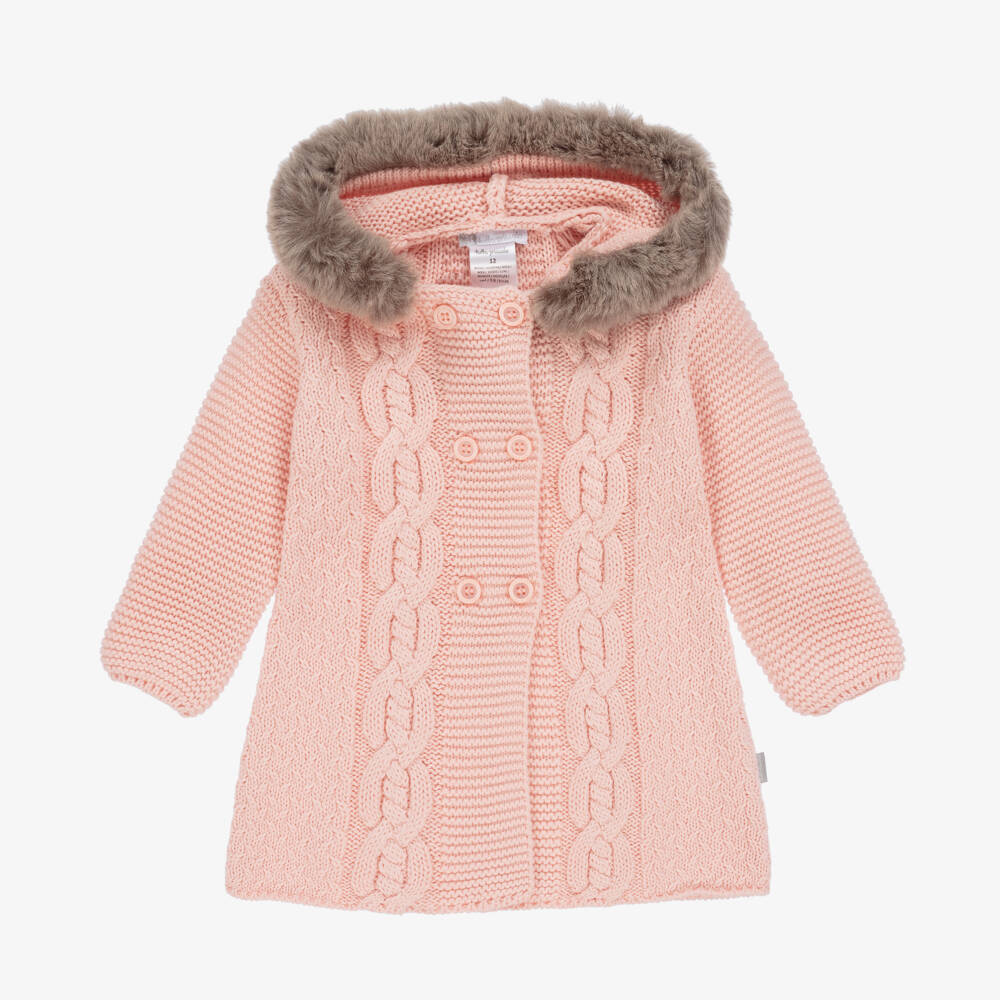 A pretty pink pram coat for little girls by Tutto Piccolo. Made from a soft cotton-blend knit with a lovely cable-knit pattern, this hooded coat has a contrasting brown faux fur trim. It fastens with double-breasted buttons for a neat finish.