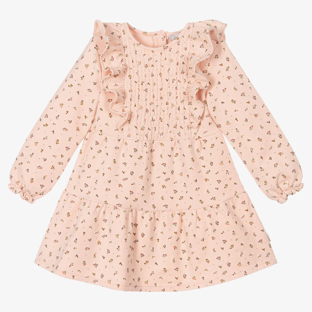 Sweet pale pink cotton jersey dress for girls by Tutto Piccolo, with lovely ruffle trims on the front and shoulders. Decorated with a sweet ditsy floral pattern, it has a shirred front panel and puffed sleeves. It fastens with a concealed zip on the back, for straight-forward dressing without detracting from the beauty of the dress.
