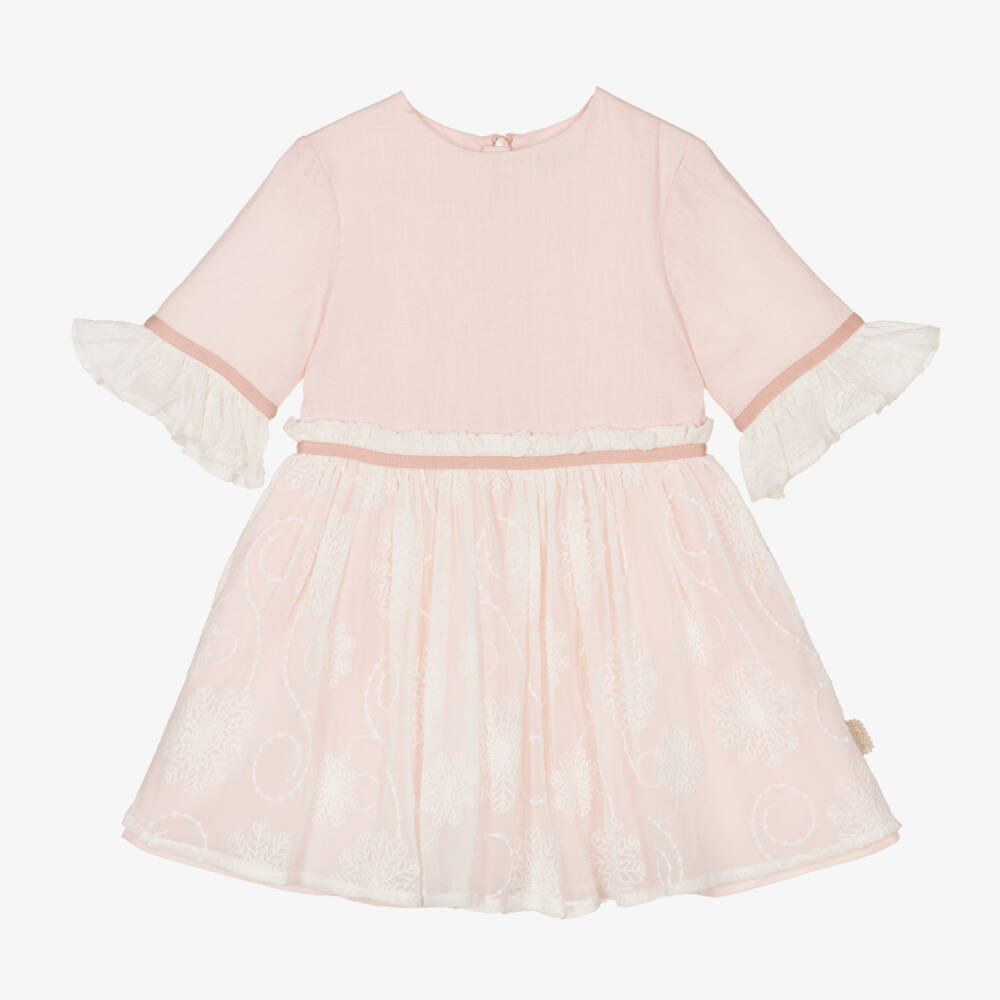 Pale pink dress for girls by Tutto Piccolo, combining lightweight linen with a beautifully embroidered lace overlay. Fastening with a zip on the back, it has three quarter length sleeves with matching lace trims. It has a dusky pink trim on the gathered waist and a full, lined skirt for added comfort.