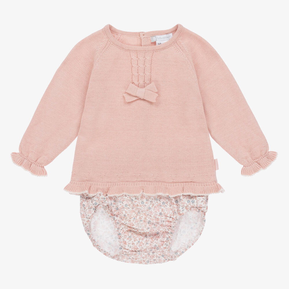Traditionally styled, dusky pink floral shorts set for girls by Tutto Piccolo. Made in a soft knit, the sweater has cable knit and bow detailing, with frilled trims and button fastenings on the back. It pairs beautifully with the soft cotton pink floral shorts. They have a gently elasticated waistband and cuffs, with bows on the front completing the sweet look.