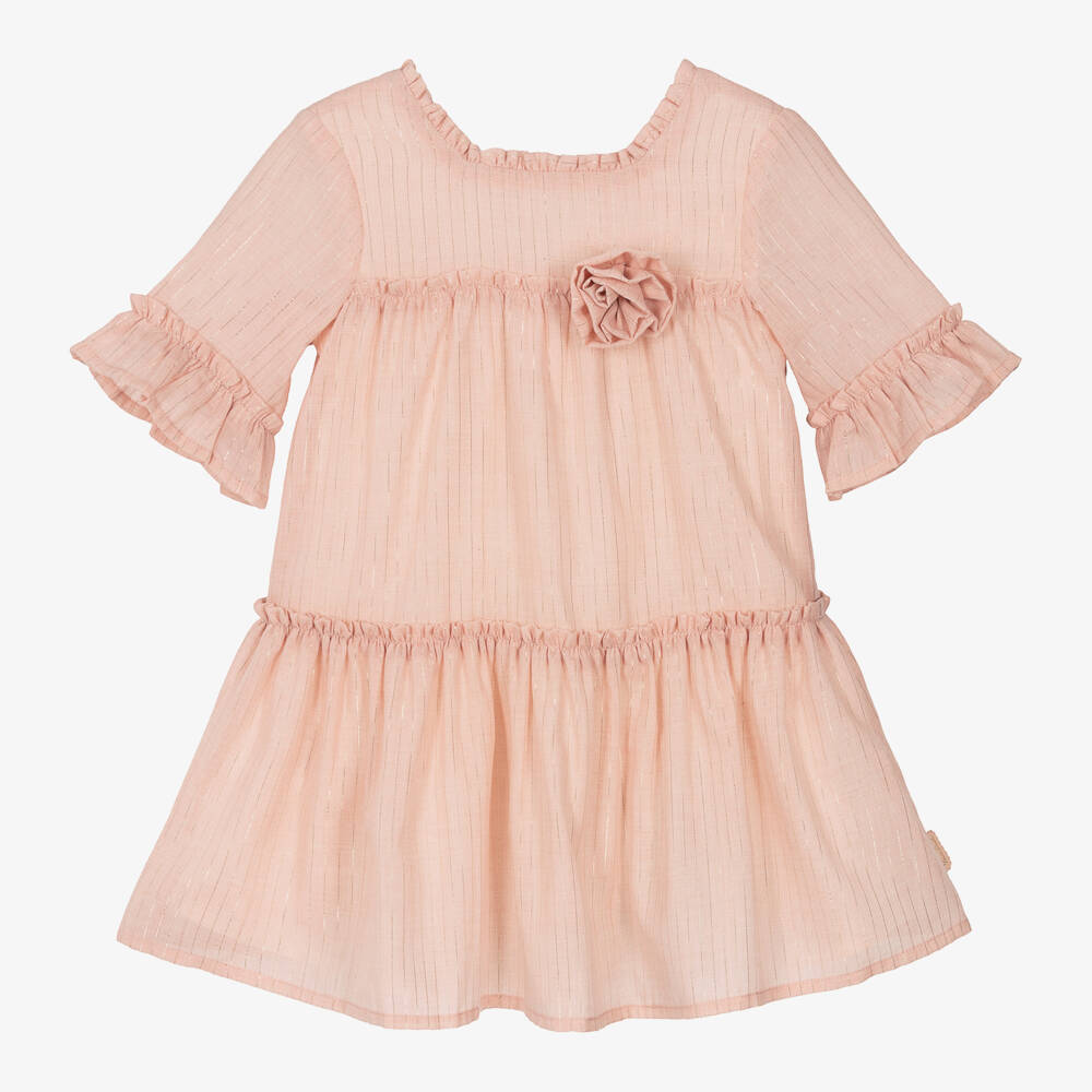 From Tutto Piccolo, a pale pink dress for girls with shimmery gold stripes and pretty ruffles. This V-back design has elbow-length sleeves, a floral appliqué and a fixed bow around the back. It is made in a soft, lightweight cotton blend with a soft lining and concealed side zip fastening.