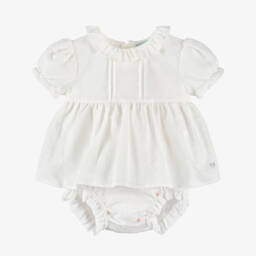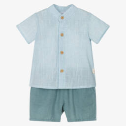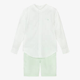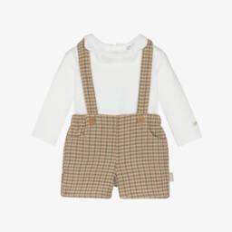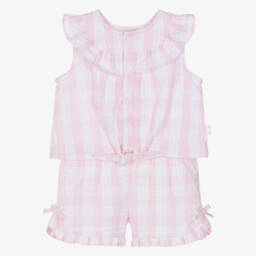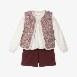 Offering a classic look with a modern twist, this charming pink and green outfit for girls is by Tutto Piccolo. The set includes a cosy knitted sweater with a classic Fair Isle pattern, checked shorts with an elasticated waist and velvet bow detail, and a white cotton blouse with pretty ruffle trims. A pair of grey tights complete the outfit, adding warmth and comfort.