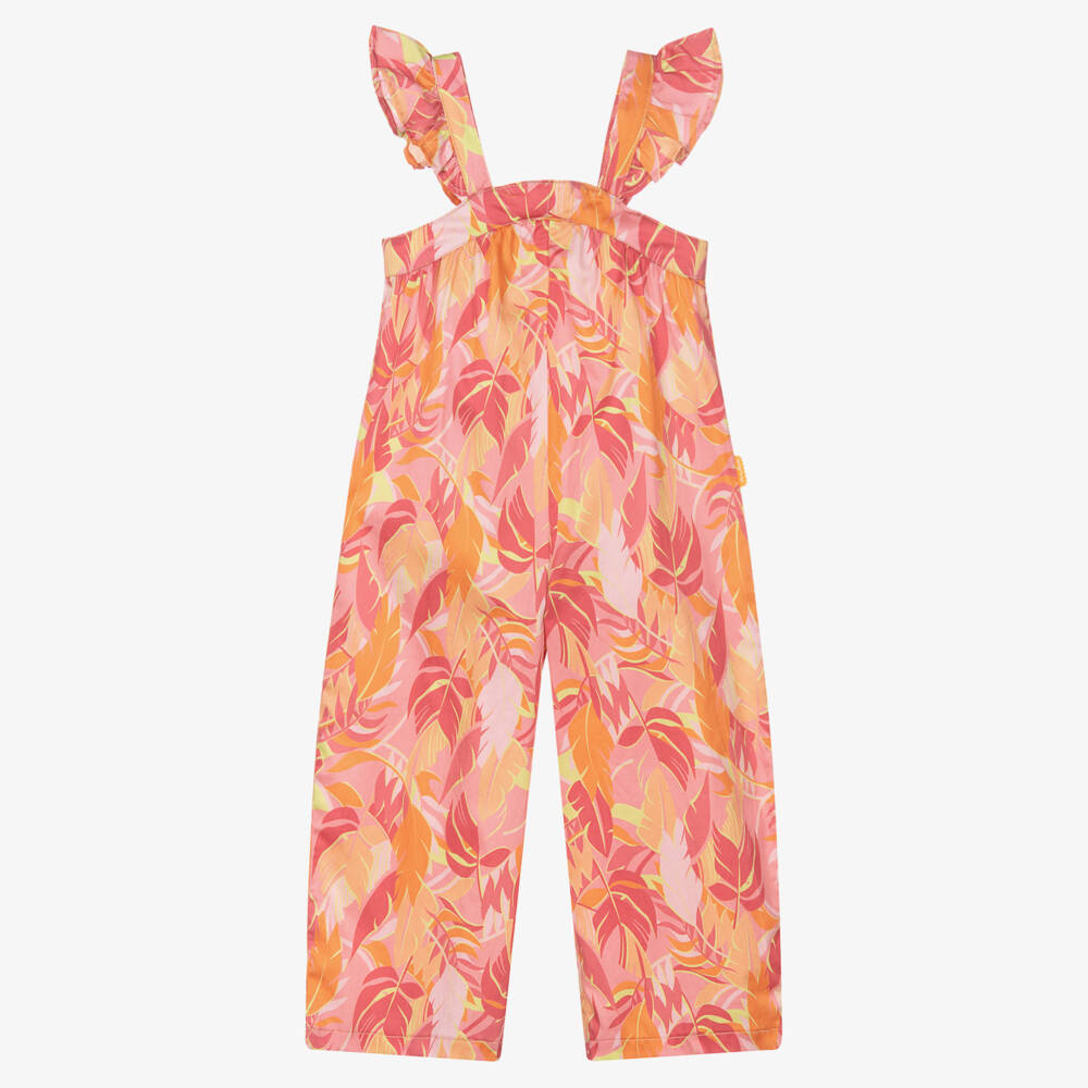 Beautiful orange and pink jumpsuit for girls, with a tropical palm leaf design, by Spanish brand Tutto Piccolo. Made in silky soft and smooth cotton, it has ruffle trimmed shoulder straps and a concealed zip fastening at the back for a relaxed, easy-to-wear style.