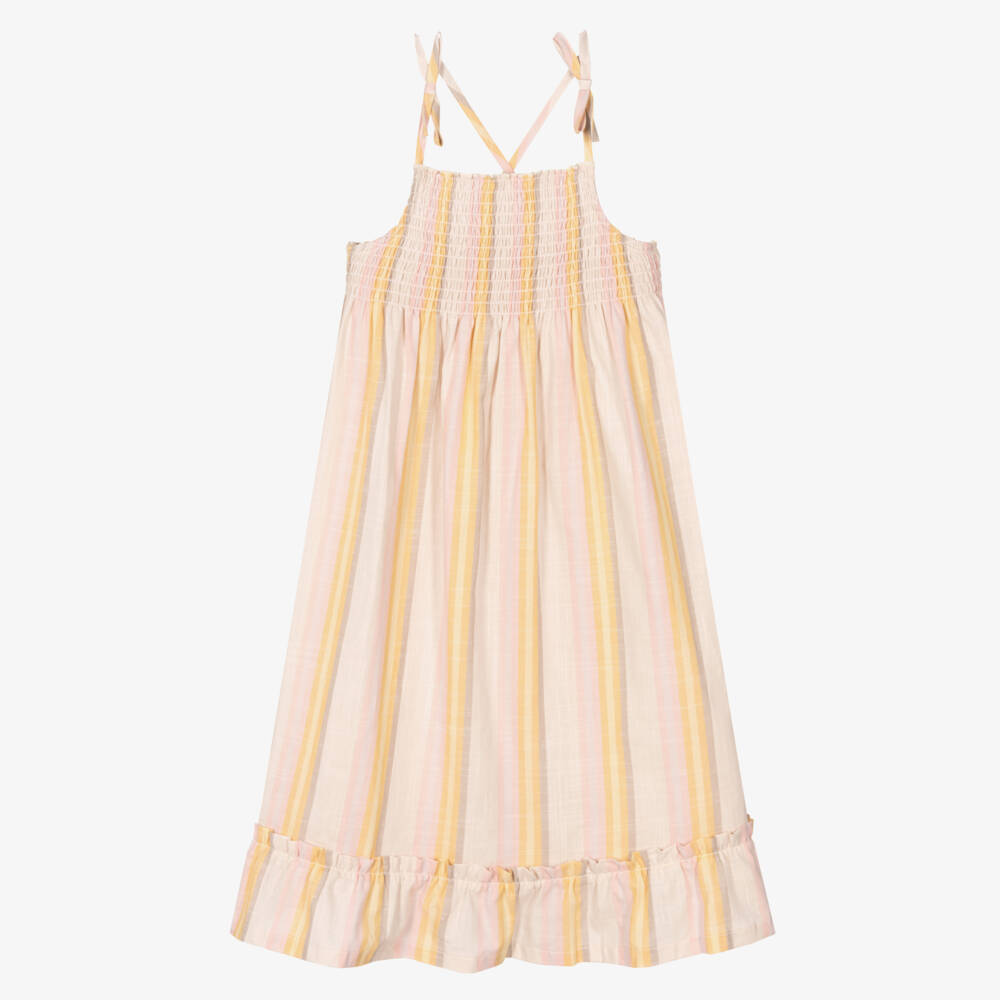 Gorgeous orange and pink striped dress for girls by Spanish brand Tutto Piccolo, made in soft and lightweight cotton. Ideal as a beach cover-up, it has bows appliquéd on the shoulder straps and a comfortable shirred bodice.