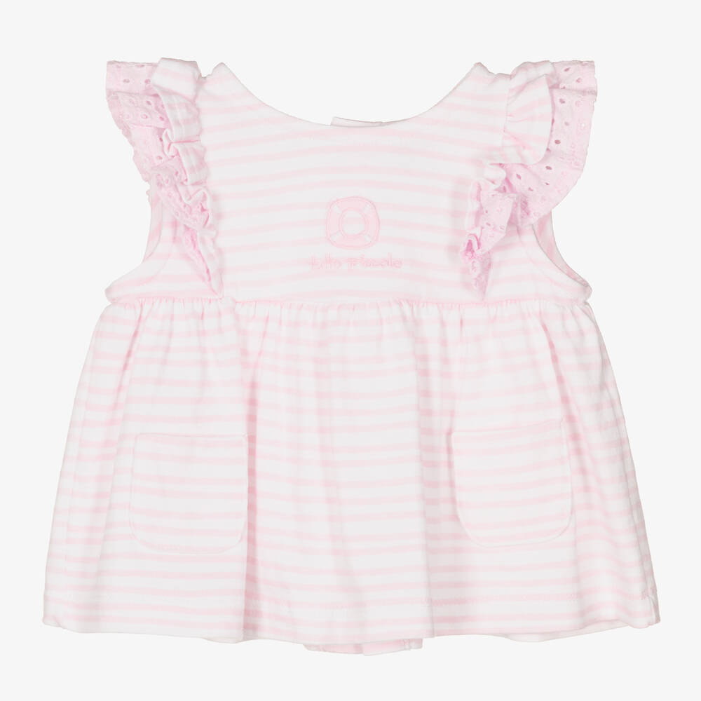 A pink and white cotton shorts set for little girls by Tutto Piccolo. The striped, jersey top has layered frill sleeves and popper fastenings on the back. It has a gathered waist, patch pockets on the front, and a lifebuoy motif on the chest for a nautical touch. Fully lined, the pink shorts are made in soft broderie anglaise, styled in an all-over floral design with a fixed bow on the front. The elastic on the waist and at the leg makes for comfortable wear.
