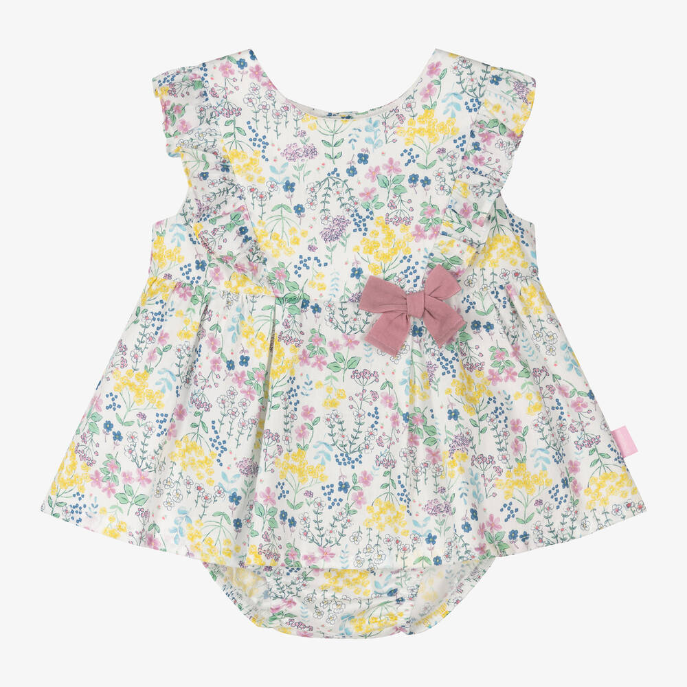 White with a pink and yellow floral print, this pretty dress for little girls is by Tutto Piccolo. Made in lightweight cotton sateen, it has ruffle trims and a sweet bow on the front. Partly lined in cotton voile and with buttons for fastening, it comes with a pair of matching knickers to complete the look.