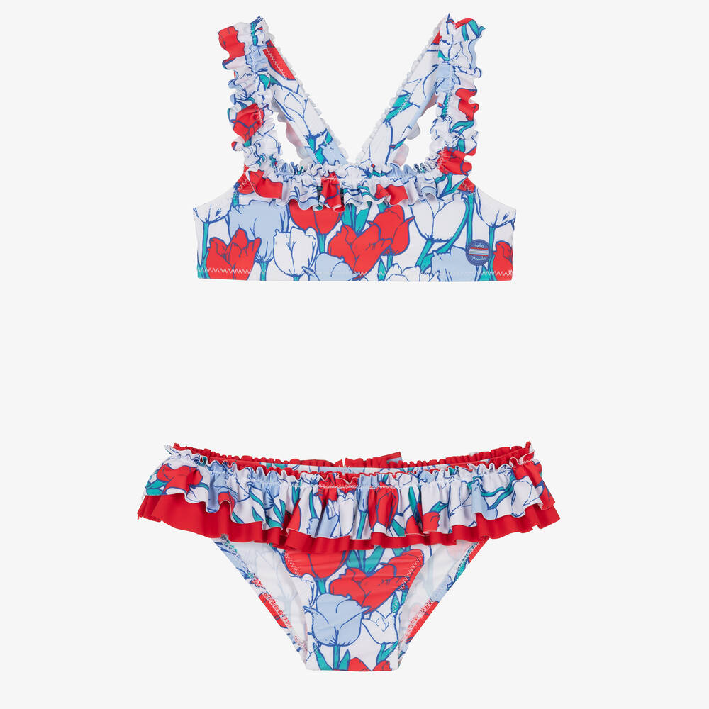 Cute white bikini for girls by Tutto Piccolo, with a pretty blue, white and red tulip pattern. Soft and stretchy, the top has a sweet ruffle trim and a rubberised logo patch on the front. It has a ruched back to ensure a good fit. The bottoms have a matching ruffle trim, with a coordinating striped bow on the back to finish.