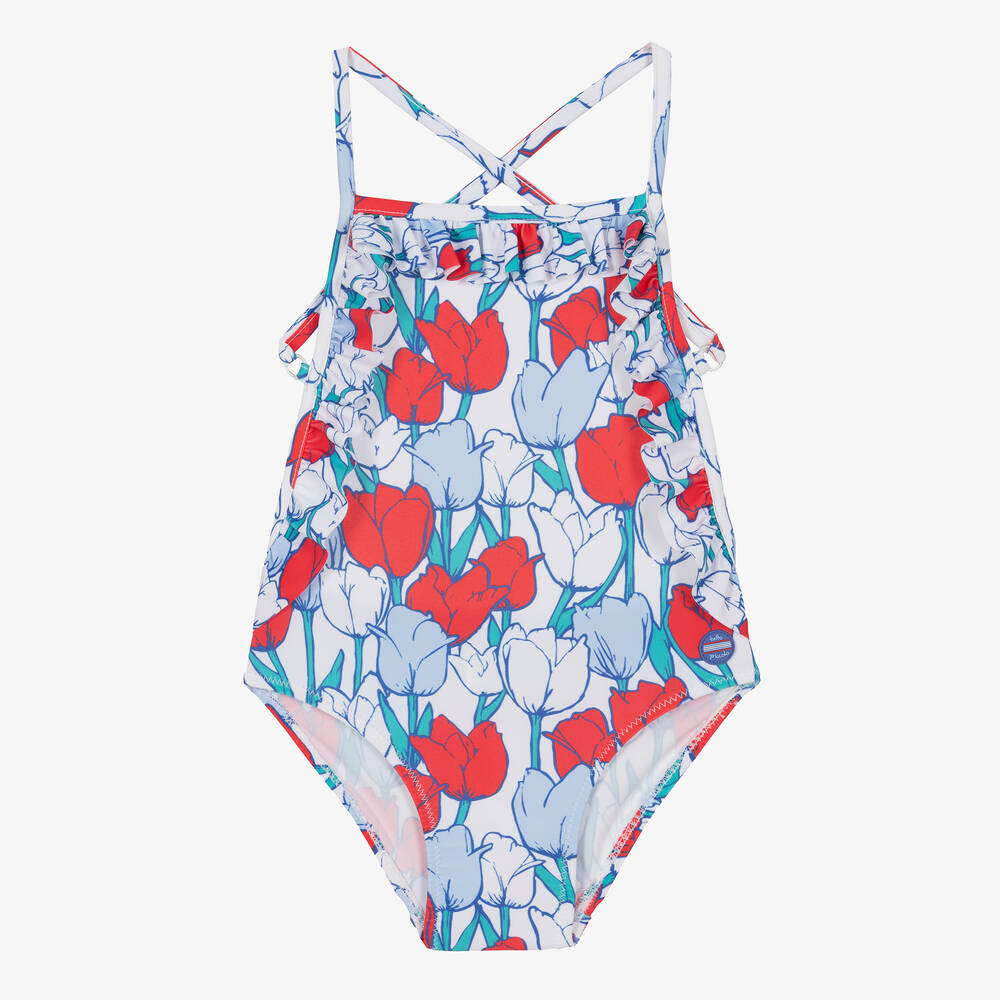 White swimsuit for girls by Tutto Piccolo, with a pretty blue, white and red tulip pattern. Soft & stretchy, it has sweet ruffle trims on the front, a stylish low cut back and narrow, adjustable straps.