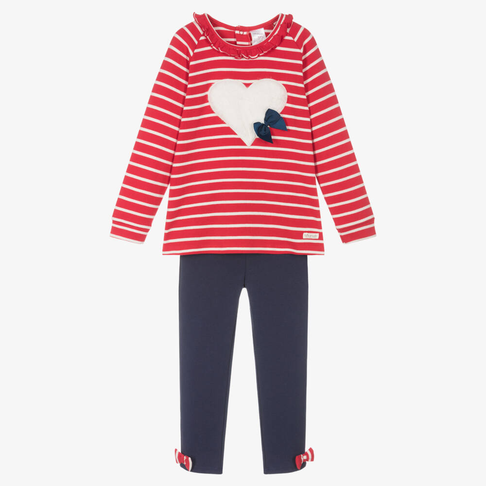 Red and navy blue leggings set for girls by Tutto Piccolo, made in soft, mid-weight cotton jersey. The red and white striped top has a ruffle collar and a white faux fur heart appliqué on the front with a blue grosgrain ribbon bow. There is a logo tab by the hem and popper fastenings on the back. The navy blue leggings have cute red and white bow trims on the ankles and a comfortable elasticated waistband.