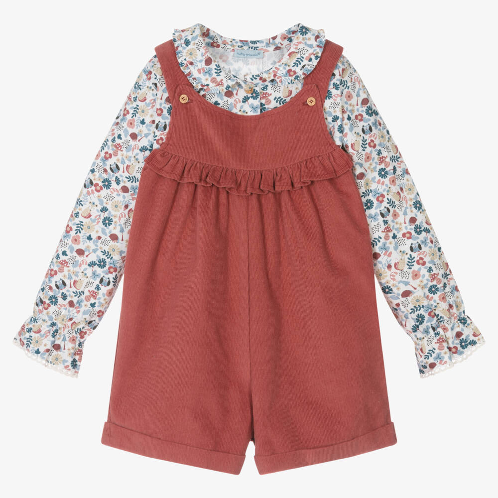 Traditionally styled, deep rose pink dungaree shorts set for girls by Tutto Piccolo. Comfortable to wear, the cotton corduroy dungaree shorts have a frill on the front, with wood effect button fastenings on the shoulder straps. The cotton and viscose blend blouse has a charming floral print incorporating woodland creatures. It has a frilled collar and elasticated lace-trimmed cuffs, with button fastenings on the front.