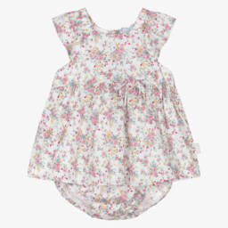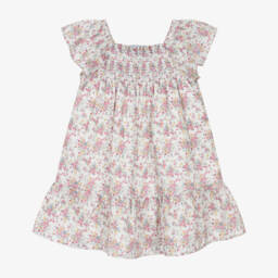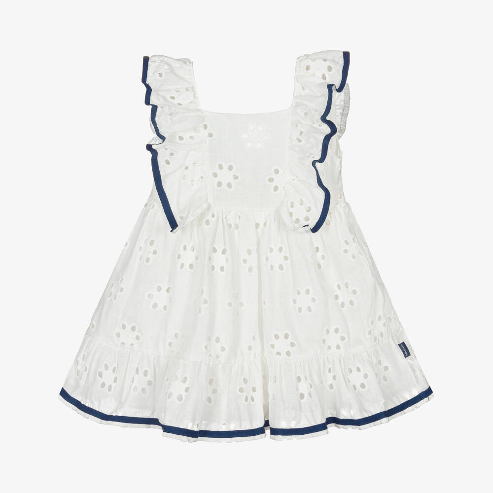 Lovely for warmer days, this white Tutto Piccolo dress for girls is made in lightweight linen and cotton blend broderie anglaise. Beautiful ruffles with navy blue trims define the style, along with sweet bow detailing on the back. It has a comfortable, lightweight lining and a concealed side zip fastening.