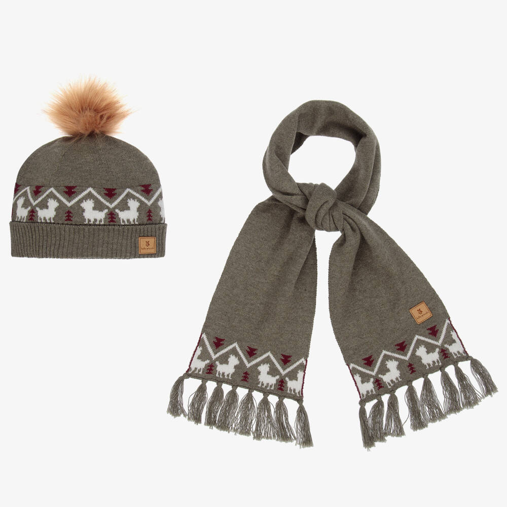 Khaki green hat set for boys, by Tutto Piccolo. The cute hat in the red and white deer print has a sweet brown pom-pom on the top and comes with a matching scarf.