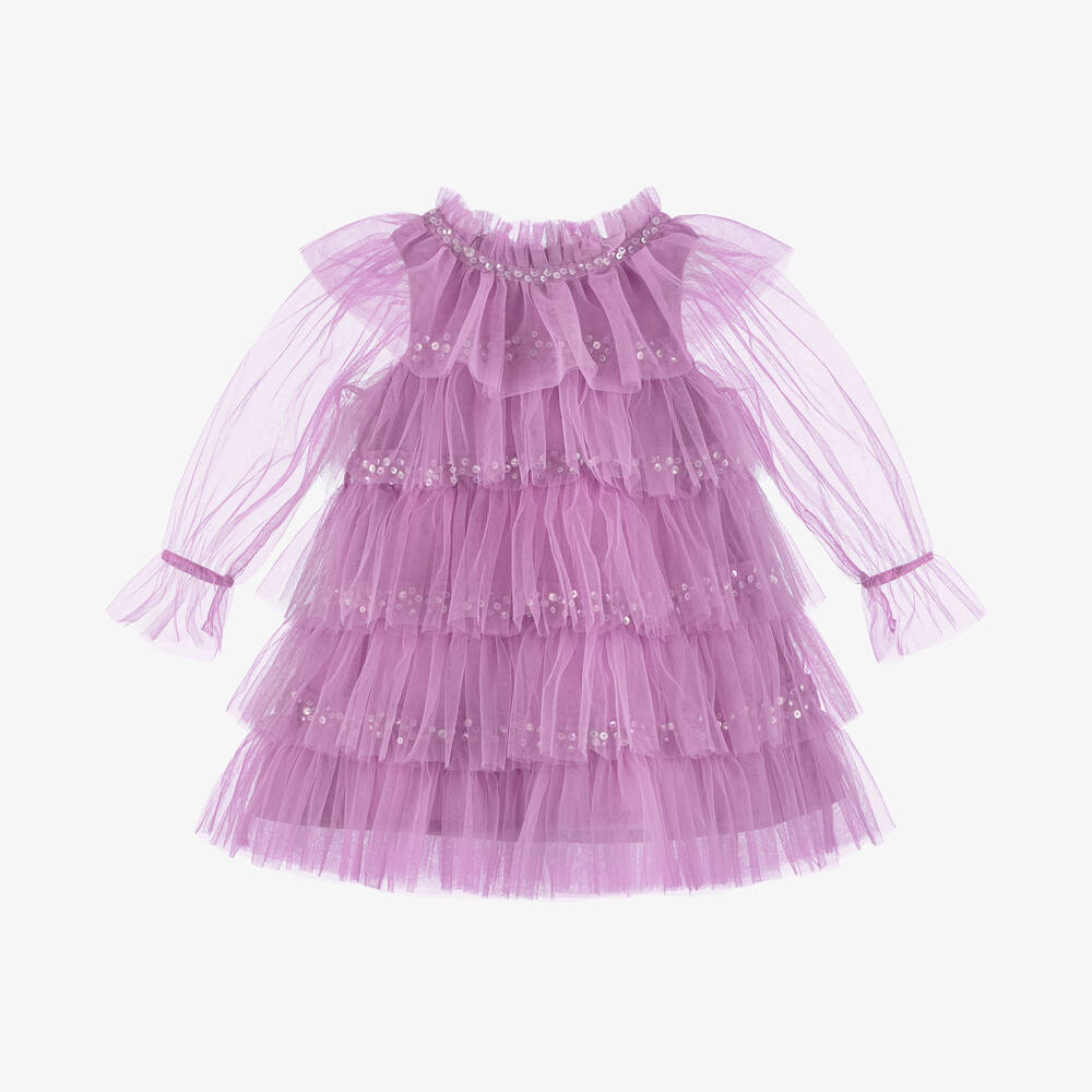 Beautiful special occasion dress for baby girls by Tutu Du Monde, in a pretty lilac purple shade. Handmade in the finest tulle for whimsical charm, this voluminous dress has a tiered, ruffle skirt. Shimmering sequins surround the style for added sparkle. The sheer, long sleeves have fluted cuffs for a pretty effect. Lined for comfort, it fastens simply with a keyhole button on the back of the neck and comes with elasticated knickers. Items are made to last and become more lovely with wear as slight fading and fraying edges adds to their charm.
