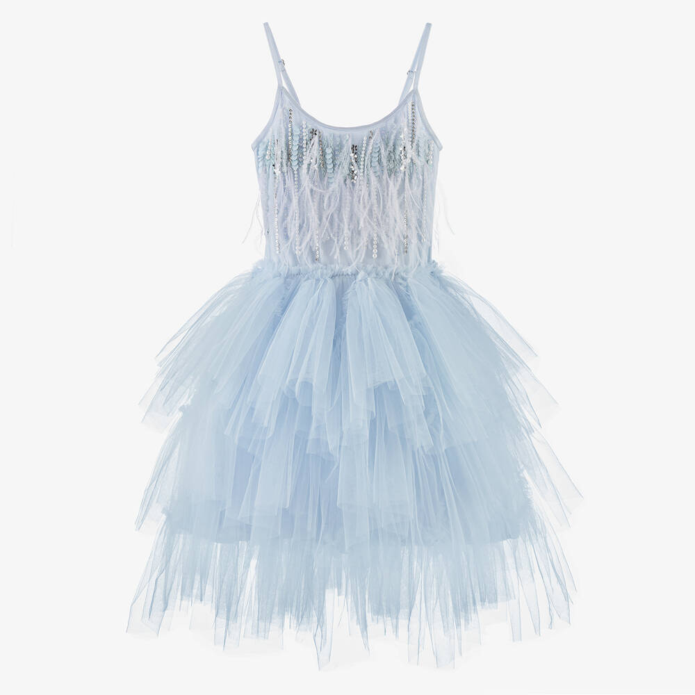 So pretty for girls, this pastel blue dress from Tutu du Monde is ideal for a special occasion. The comfortable jersey bodice has a fine tulle overlay on the front, beautifully hand-sewn with pearls, beads, sparkly sequins and wispy white feathers. The stretchy satin straps are adjustable at the back for a great fit. Adding to the charm of this stunning dress, the voluminous skirt has tiered layers of ruffled tulle and is lined in lightweight voile for ultimate comfort. Items are made to last and become more lovely with wear as slight fading and fraying edges add to their charm.