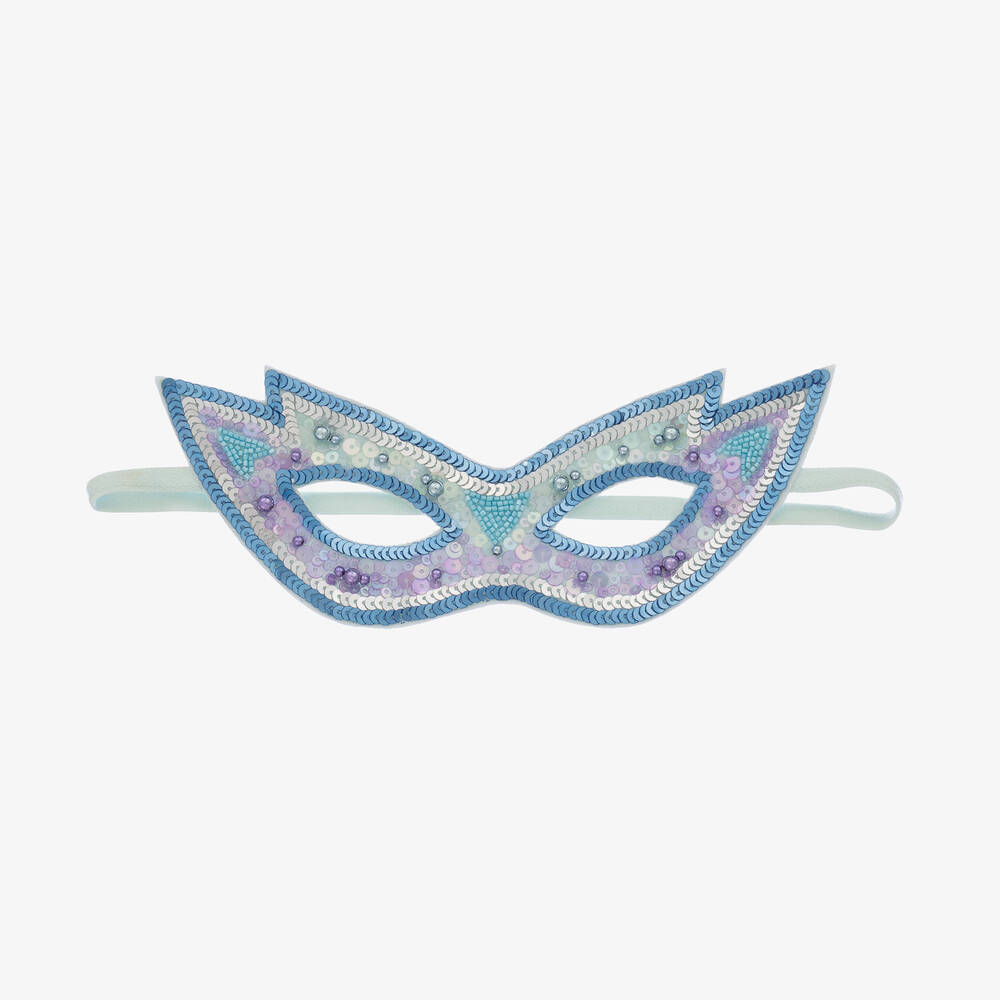 A fun superhero mask for girls by Tutu du Monde. In blue, silver and lilac purple, it is designed with shiny beads and sparkly sequins that catch the light beautifully. The mask has an elasticated strap at the back that ensures it stays comfortably in place.