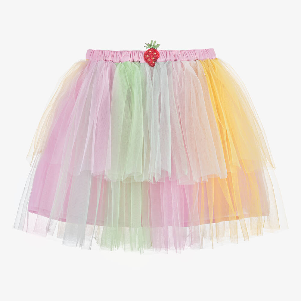 A beautiful tulle skirt for girls by Tutu du Monde, in pastel rainbow shades of pink, blue, green and yellow. It has a hand-embellished strawberry decorated on the silky ruched waistband for a playful, spirited look. This skirt is fully lined in soft voile that is delicate against the skin. Items are made to last and become more lovely with wear as slight fading and fraying edges add to their charm.