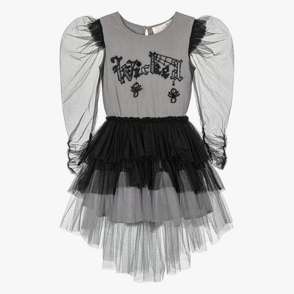 In time for the spooky season, this grey and black dress for girls by Tutu du Monde is inspired by Wednesday Addams. The voluminous tutu skirt is made with layers of delicate, fine tulle, and has a cascading shape for added style. The puffed sleeves are made using sheer black tulle for a dramatic look. Ornate black embellishments can be found across the bodice, with Halloween-inspired spiderwebs and gothic font forming the word 'Wicked'. It is lined in lightweight cotton for comfort and fastens with a keyhole button on the back of the neck. Items are made to last and become more lovely with wear as slight fading and fraying edges adds to their charm.