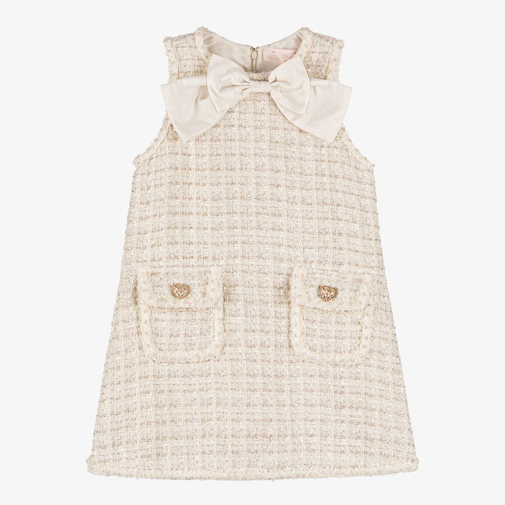 Ivory with a sparkly gold thread, this stylish shift dress for girls is by Australian brand Tutu du Monde. It has textured trims, beautifully hand-embellished with faux pearls for a timeless classic look. Lined in silky fabric for a luxurious feel, the dress has two front pockets, trimmed with elegant gold-tone heart buttons. It secures down the back with a concealed zip and hook fastening, and is finished on the front with a detachable statement bow.
