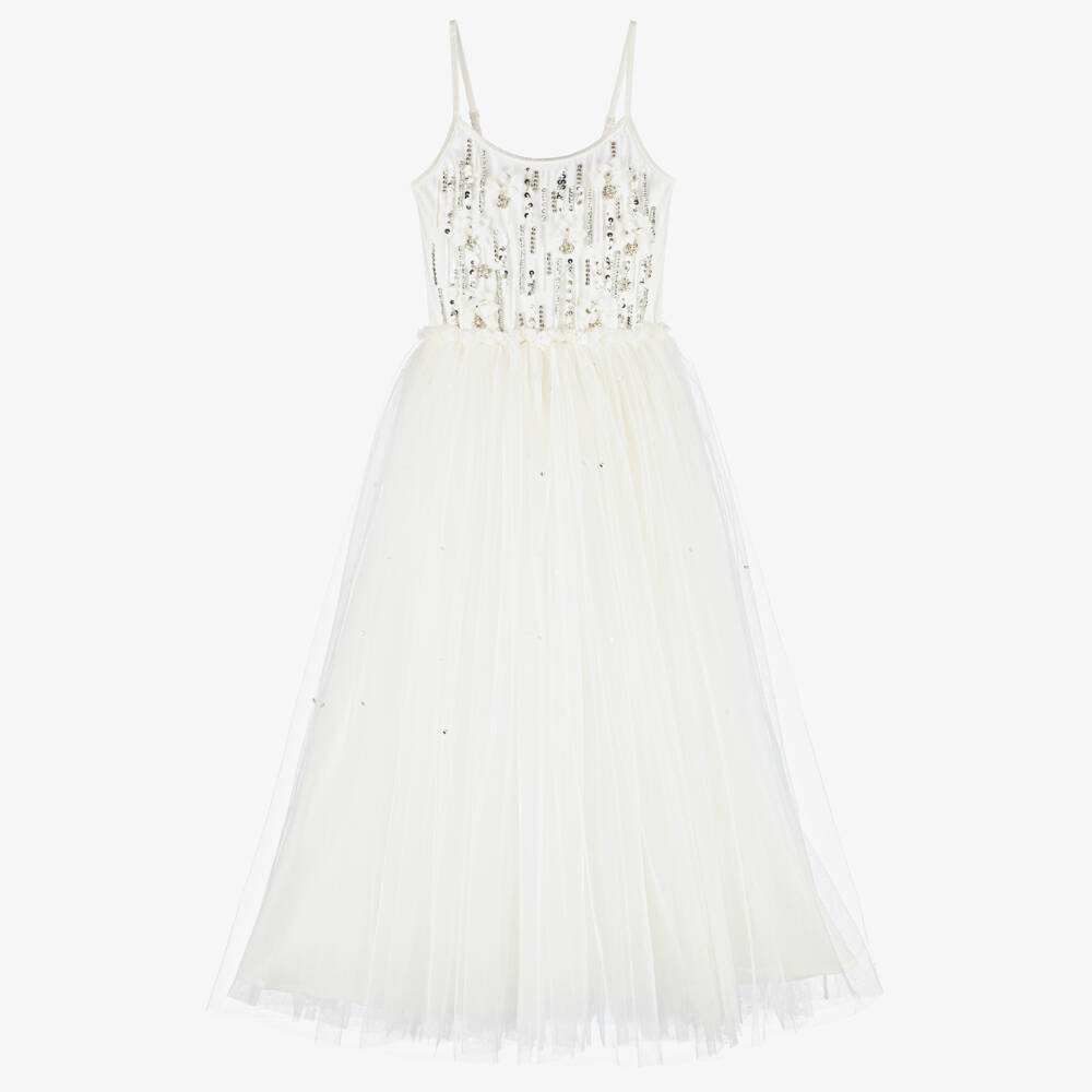 An ivory dress for girls by Tutu du Monde, hand-crafted by Indian artisans in luxurious layers of tulle. Soft to the touch, the cotton jersey bodice is hand-embellished with sparkling sequins and diamanté's, adding elegance to this timeless style. It has adjustable shoulder straps and a delicate cotton voile lining. Items are made to last and become more lovely with wear as slight fading and fraying edges adds to their charm.