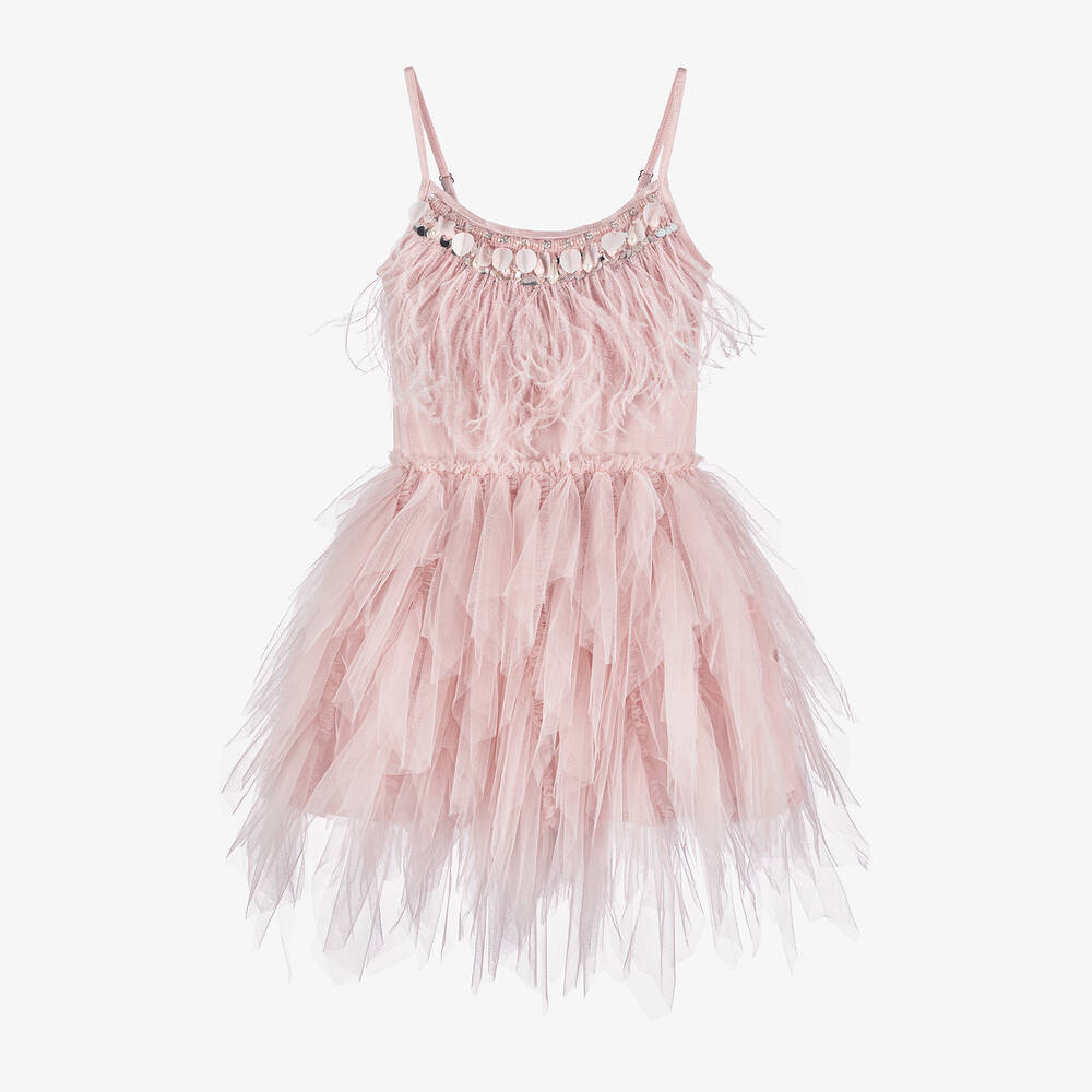 Gorgeous pale pink special occasion dress for girls from Tutu du Monde. With adjustable shoulder straps, the jersey bodice is beautifully hand-embellished with shimmering beads, sequins and delicate faux feathers. Wispy layers of soft tulle cascade from the gently elasticated waist creating a stunning skirt that is lined in lightweight cotton for ultimate comfort. Items are made to last and become more lovely with wear as slight fading and fraying edges add to their charm.