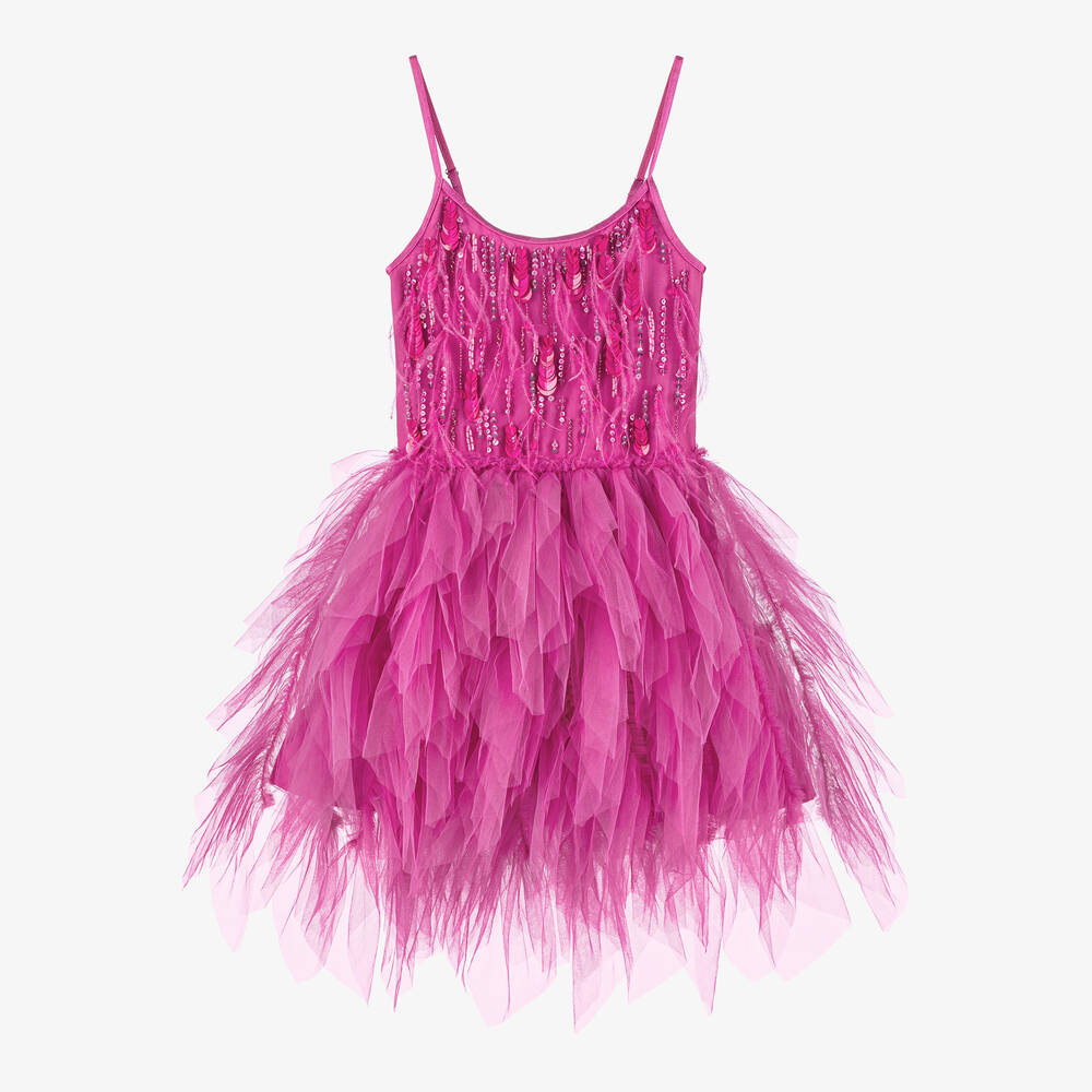 A deep pink handmade dress for girls by Tutu du Monde. Decorated for shimmer and sparkle, the bodice has rows of beads, sequins and delicate feathers. Beautiful, petal-like wisps of tulle cascade from the waist to the skirt hem, adding fabulous flounce. Under-layered with cotton for comfort, the bodice is lined with jersey and the skirt lightweight voile. The narrow shoulder straps are adjustable for the best fit. Easy to wear, it simply slips on over the head, thanks to its elasticated waist and stretchy bodice. Items are made to last and become more lovely with wear as slight fading and fraying edges adds to their charm.