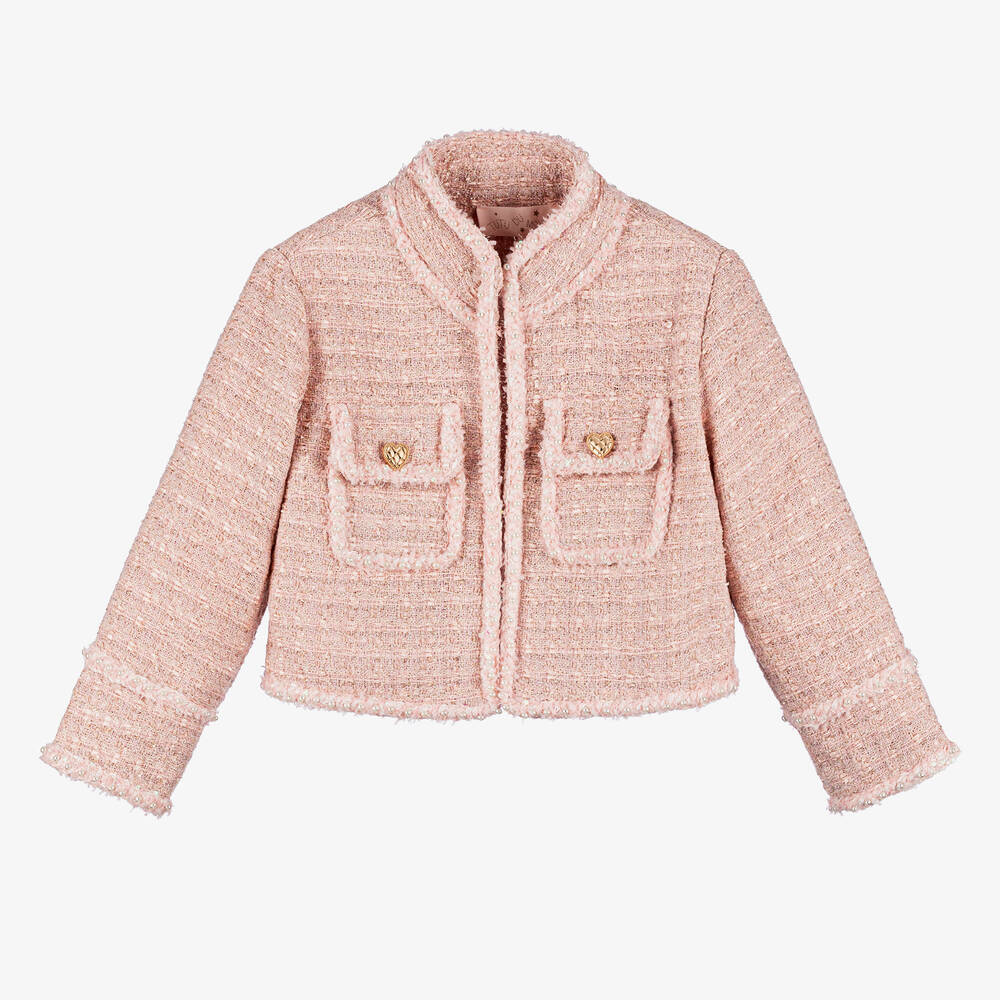 Pale pink with a sparkly silver thread, this stylish tweed jacket for girls is by Australian brand Tutu du Monde. It has textured trims, beautifully hand-embellished with faux pearls for a timeless classic look. Lined in silky fabric for a luxurious feel, the jacket has two front pockets, trimmed with elegant gold-tone heart buttons. It secures discreetly on the front with hook and eye fastenings.