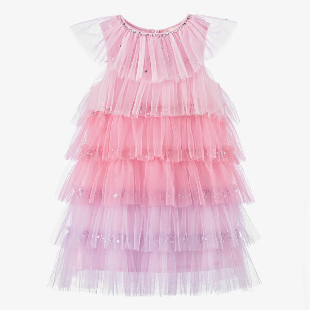 Tiered, ruffled layers of soft fine tulle in gradient shades of pink and purple create a stunning special occasion dress for girls by Tutu du Monde. The neckline and tiers are defined by beautifully hand-sewn sequins for a sparkly touch. A Childrensalon exclusive, this sleeveless design is comfortably lined in lightweight cotton voile and has an elegant keyhole button fastening on the back. Items are made to last and become more lovely with wear as slight fading and fraying edges add to their charm.